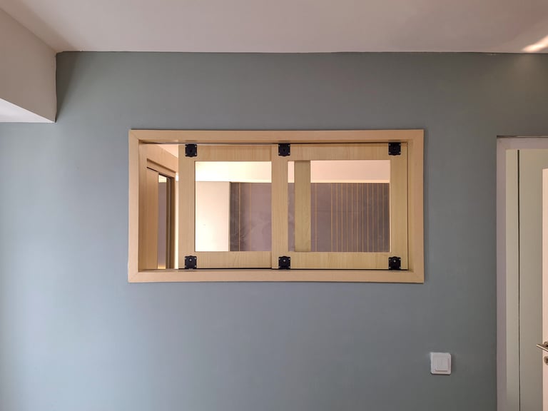 To conserve electricity, we integrated a window into the wall separating the living room and the master bedroom. This aims to facilitate the exchange of natural light and air circulation between the two areas.