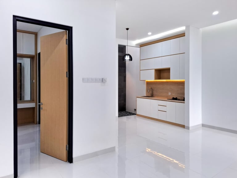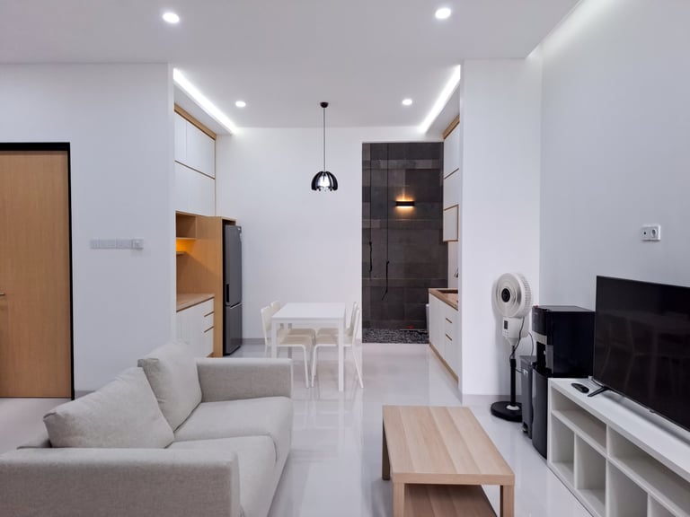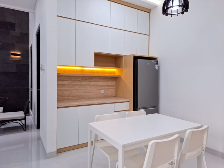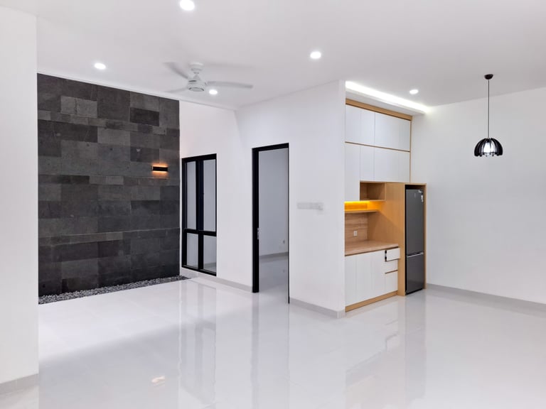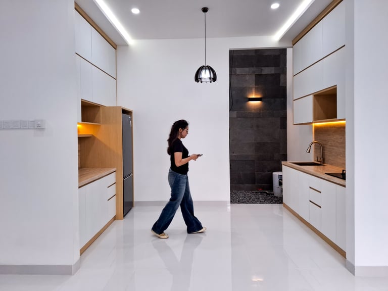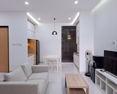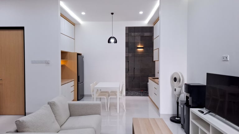 This project embodies a modern minimalist residence designed for practical urban living. The layout emphasizes clean lines, natural light, and seamless integration between the living, dining, and kitchen areas