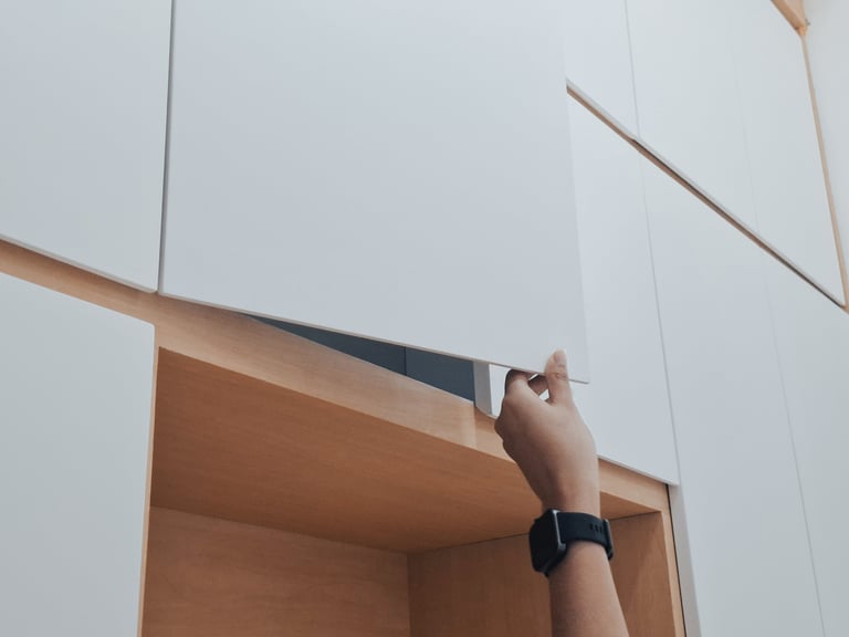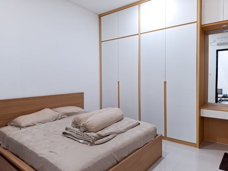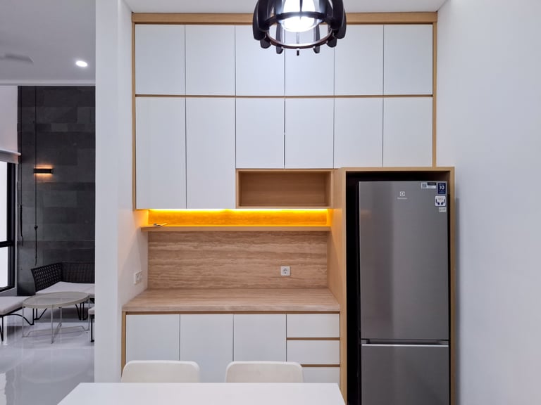 creating a sense of spaciousness within a compact footprint. Soft neutral tones, warm wood accents, and simple geometric forms define the interior, resulting in a calm and balanced atmosphere. Every element, from built-in cabinetry to lighting placement, was carefully crafted to reflect both functionality and refined aesthetics.